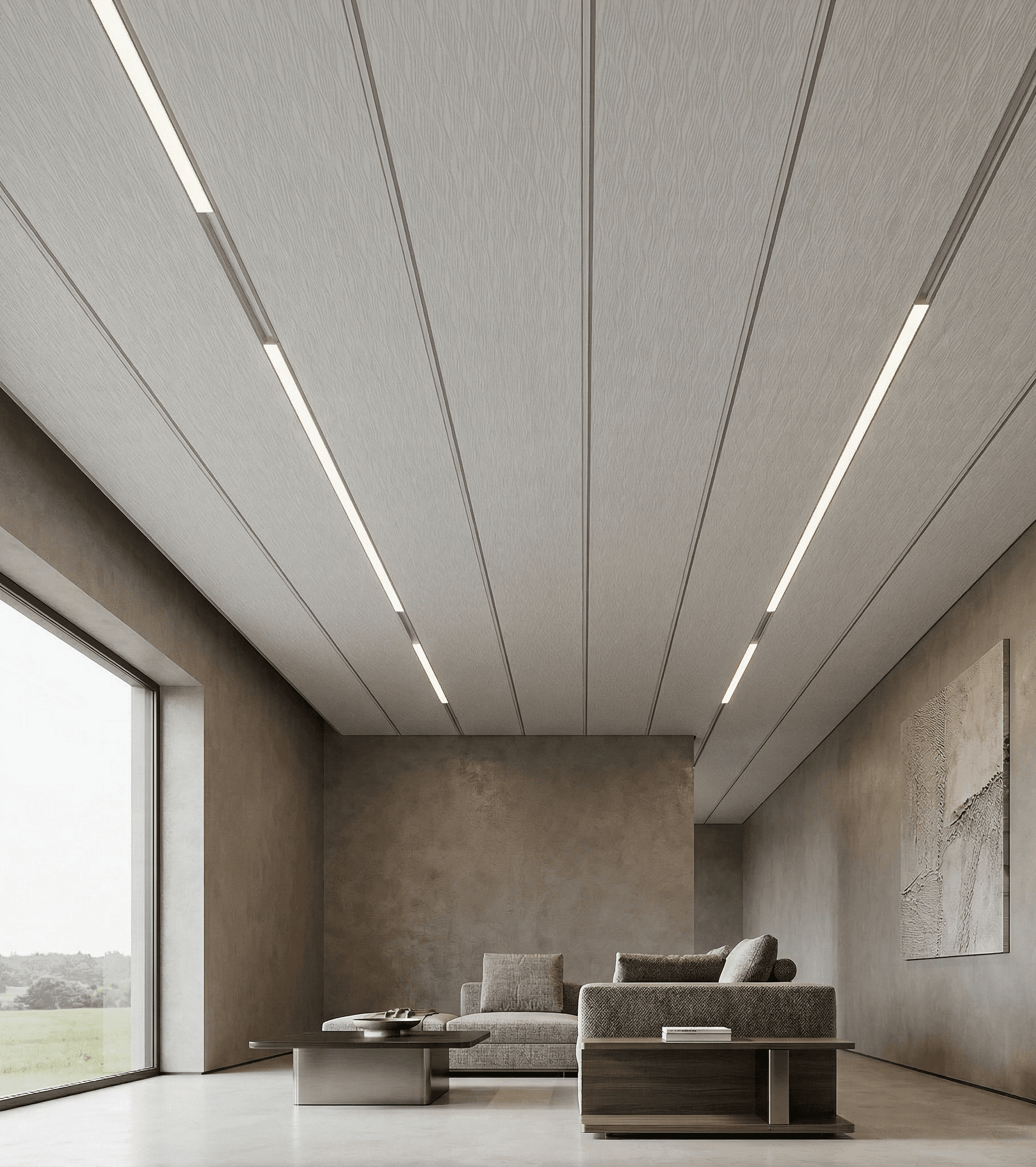- Textură Tridimensională: Modelul subtil de valuri adaugă profunzime tavanului, fragmentând lumina într-un mod plăcut și reducând monotonia suprafețelor plane.