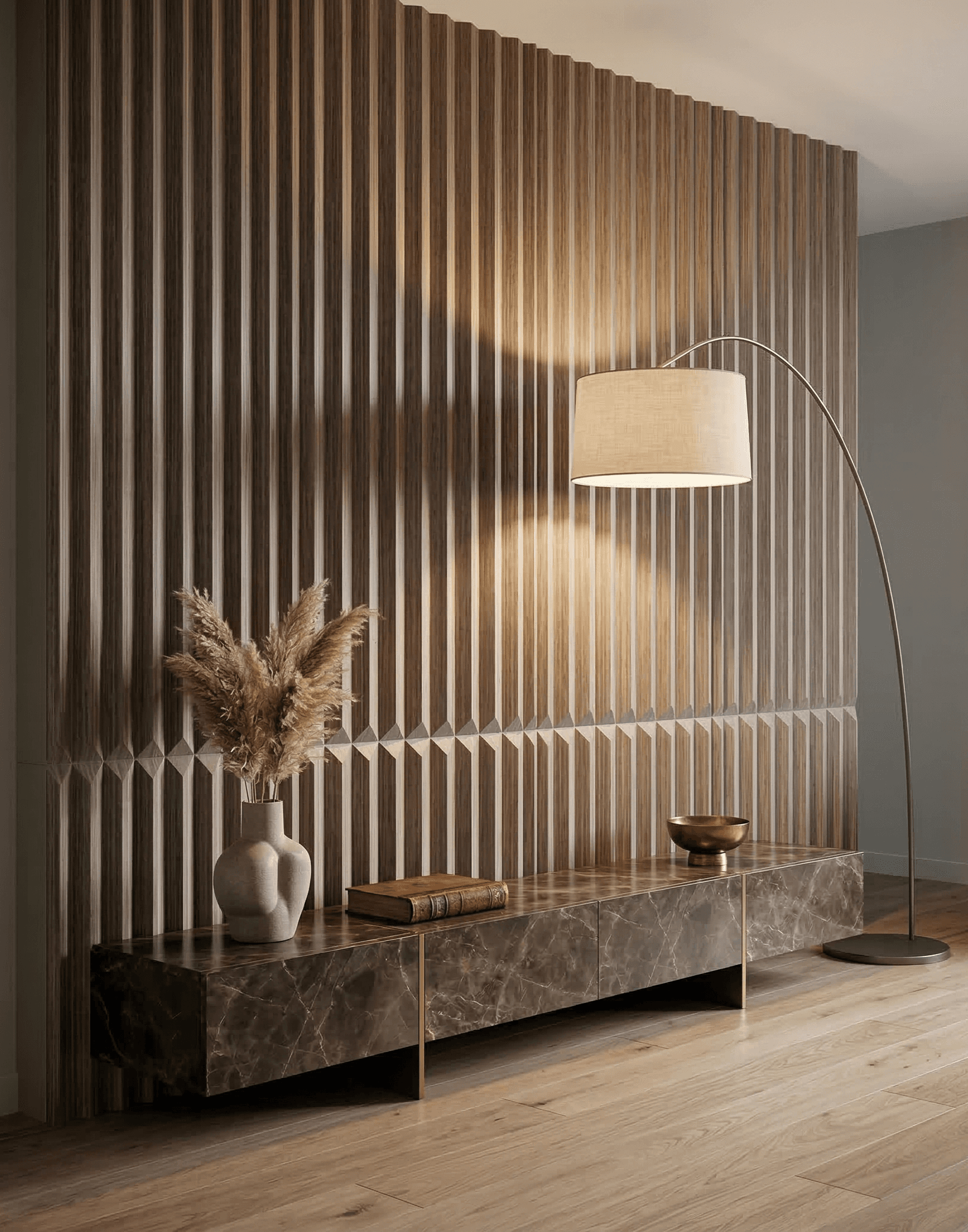 • Design Avangardist: Profilul triunghiular fragmentează lumina în mod unic, creând un joc de umbre care scoate în evidență nervurile fine ale decorului de lemn.